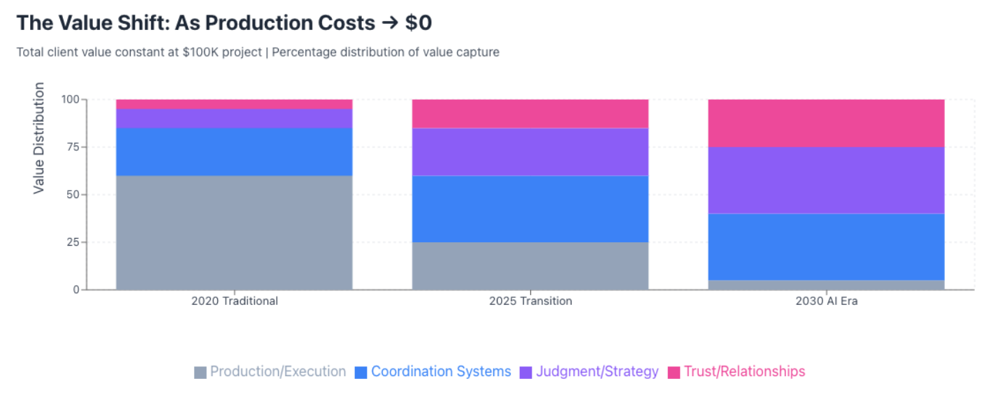 New AI tools push marketing production costs toward $0. As a result, the value for marketing teams—or really most knowledge workers—shifts from production toward coordination, judgment or strategy, and trust or relationships. Even further still, I’d argue it’s always been and will ever be about telling stories. Here’s a visualization I was working on with Claude.
